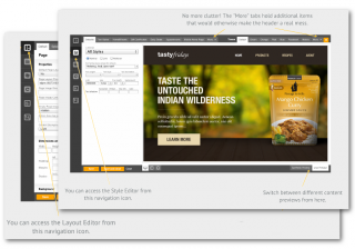 Besides the completely new DesignPro application interface, the first important functionality update that you will notice, is the added support for responsive design styling. You are now able to create custom layouts for Home, Inside and Splash pages, and then style these layouts for optimal user experience on different device screens - from a big desktop monitor, through tablets to smartphones. You can set different styling options for size, appearance and default visibility state of all page elements and thus create a custom design with responsive behavior.